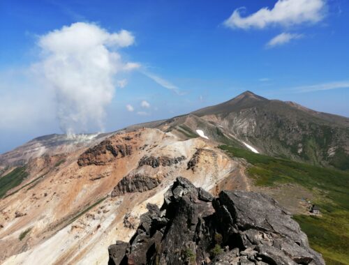 Desprès de la pausa a Sanuharai-no-atama vam continuar cap al cim, que estava a 1 hora de temps de mapa. Pel que recordo van ser uns 40 minuts, però finalment vam arribar-hi. Aquesta vegada s’arriba a la formació rocosa per la part del darrera, i aquest cop sense neu vam poder fer-ho la foto a la senyal que marca el cim.